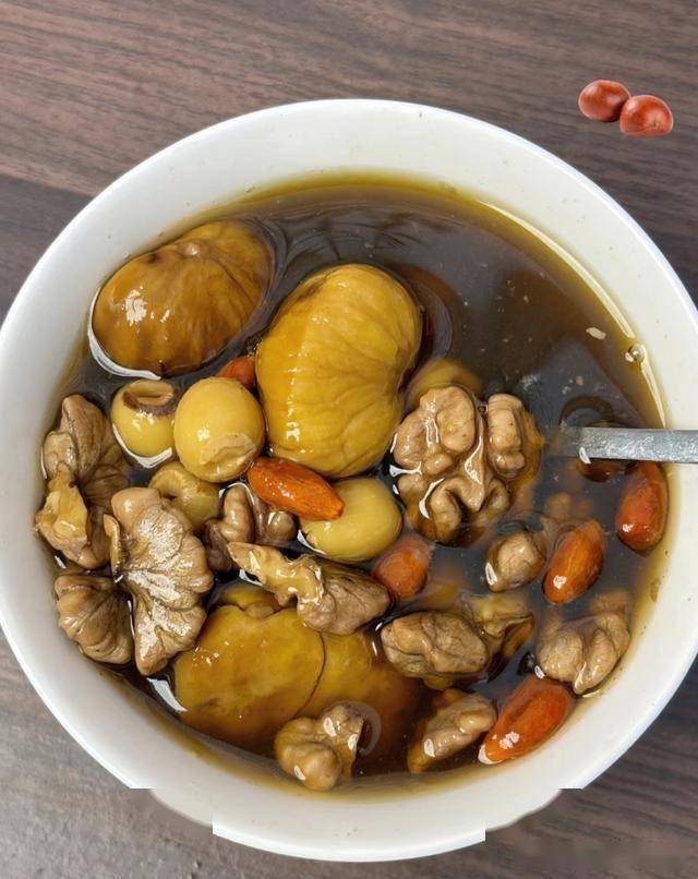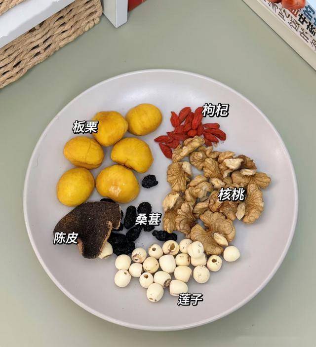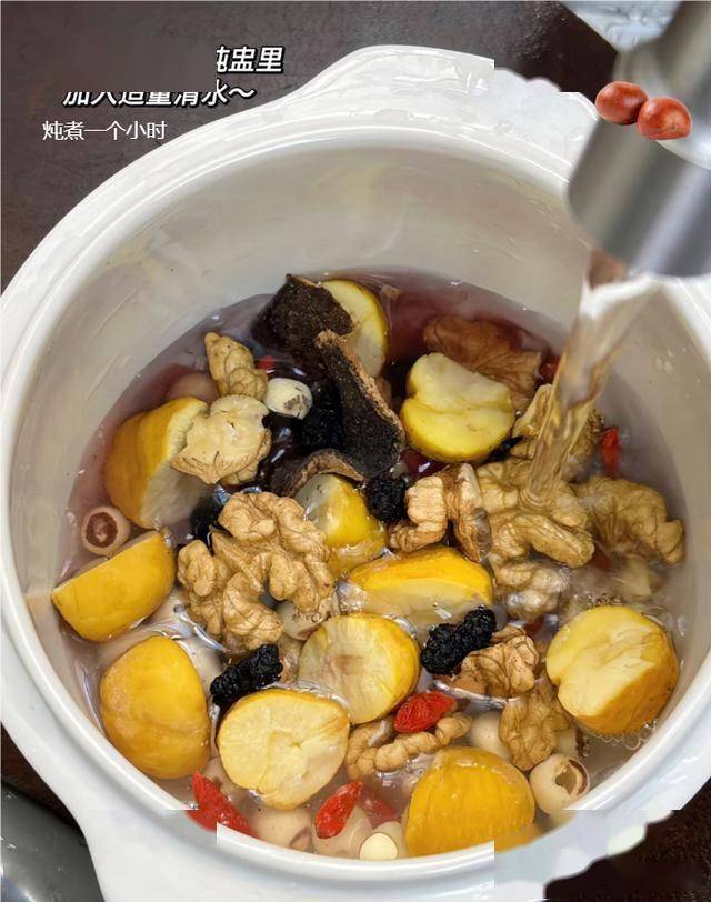 板栗10颗(去壳)、核桃仁20g、红枣5颗、枸杞10g、猪骨/鸡肉200g(可选)