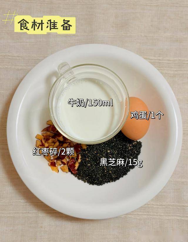 黑芝麻20g、鸡蛋1个、牛奶100ml(或清水)、蜂蜜/冰糖适量