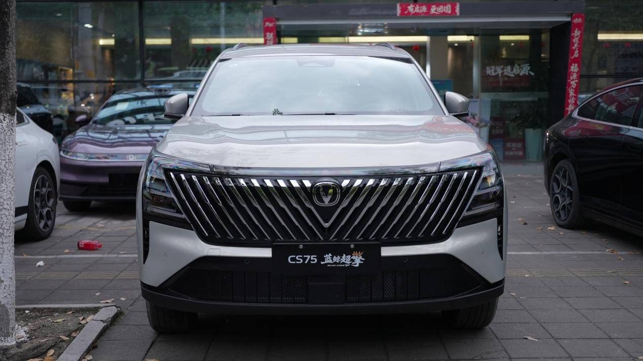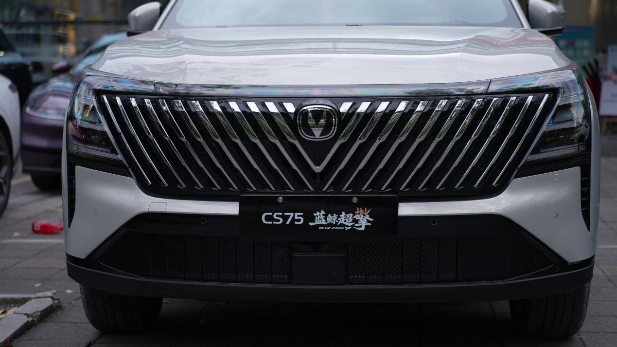 第四代CS75PLUS蓝鲸超擎的外观辨识度较为突出,前脸采用V形矩阵格栅设计,以24组精密切割的几何单元构成,横向延展宽度达1477mm,整车宽高比为1.12:1,视觉重心下沉后营造出一定的宽体姿态。车尾搭载贯穿式尾灯组,内置212颗LED光源,点亮后的辨识度在同级中处于中上水平。
