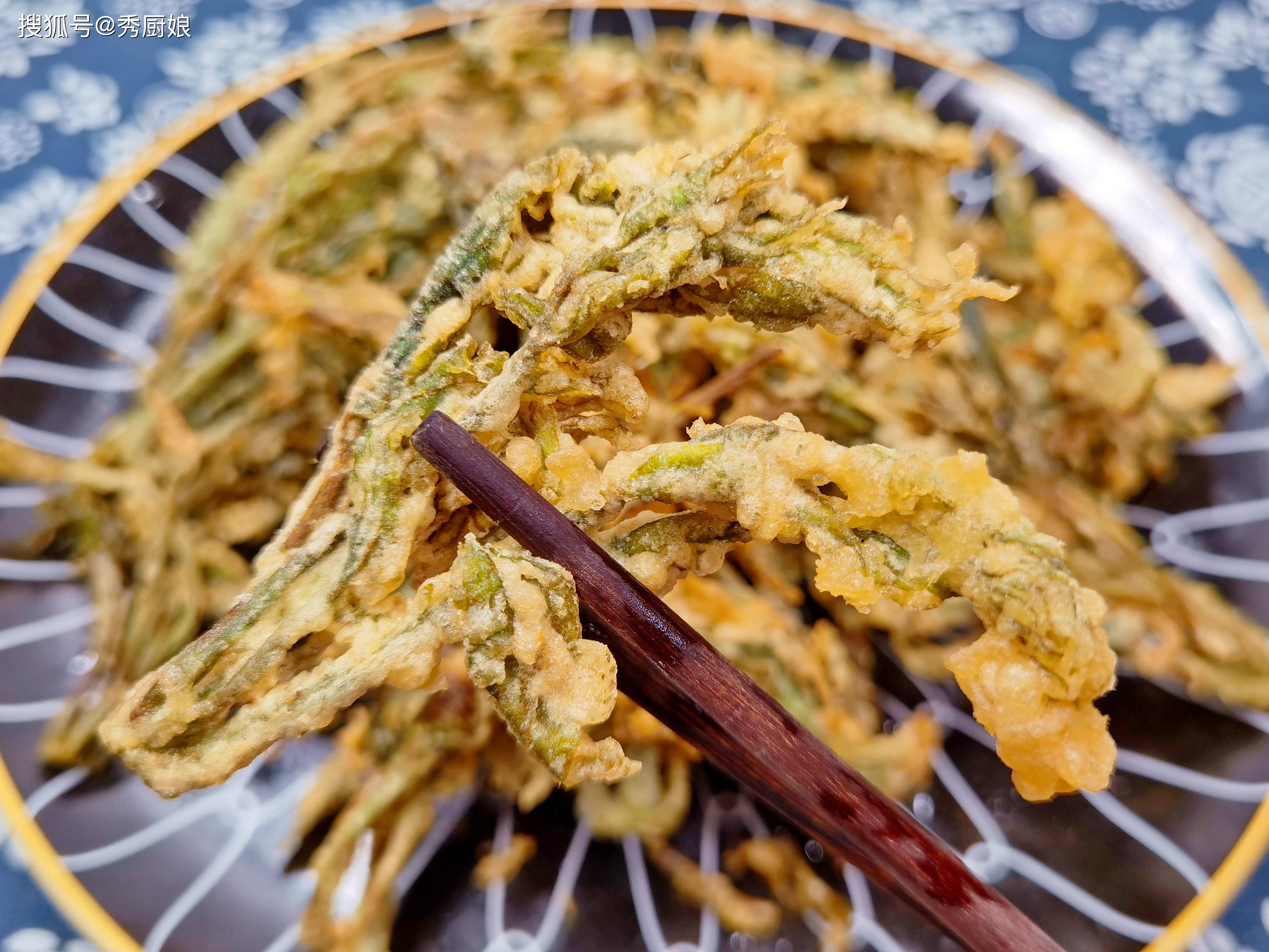 3.锅里倒油,油温烧到六成热,把焯好的香椿芽在面糊里打个滚,裹匀了,一根根下锅炸。中火慢炸,炸到表面金黄酥脆,浮在油面上就捞出来。趁热咬一口,外皮酥脆,里面的香椿带着独特的香气在嘴里散开,形状像条小鱼,味道可太香了。