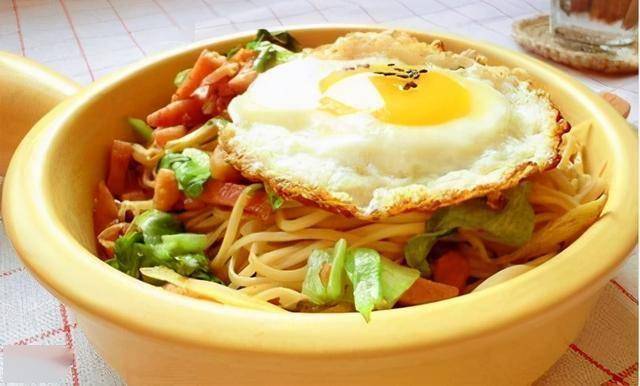 6、重新起锅,煎一个荷包蛋,煎好的鸡蛋盛出放在面条上面即可。