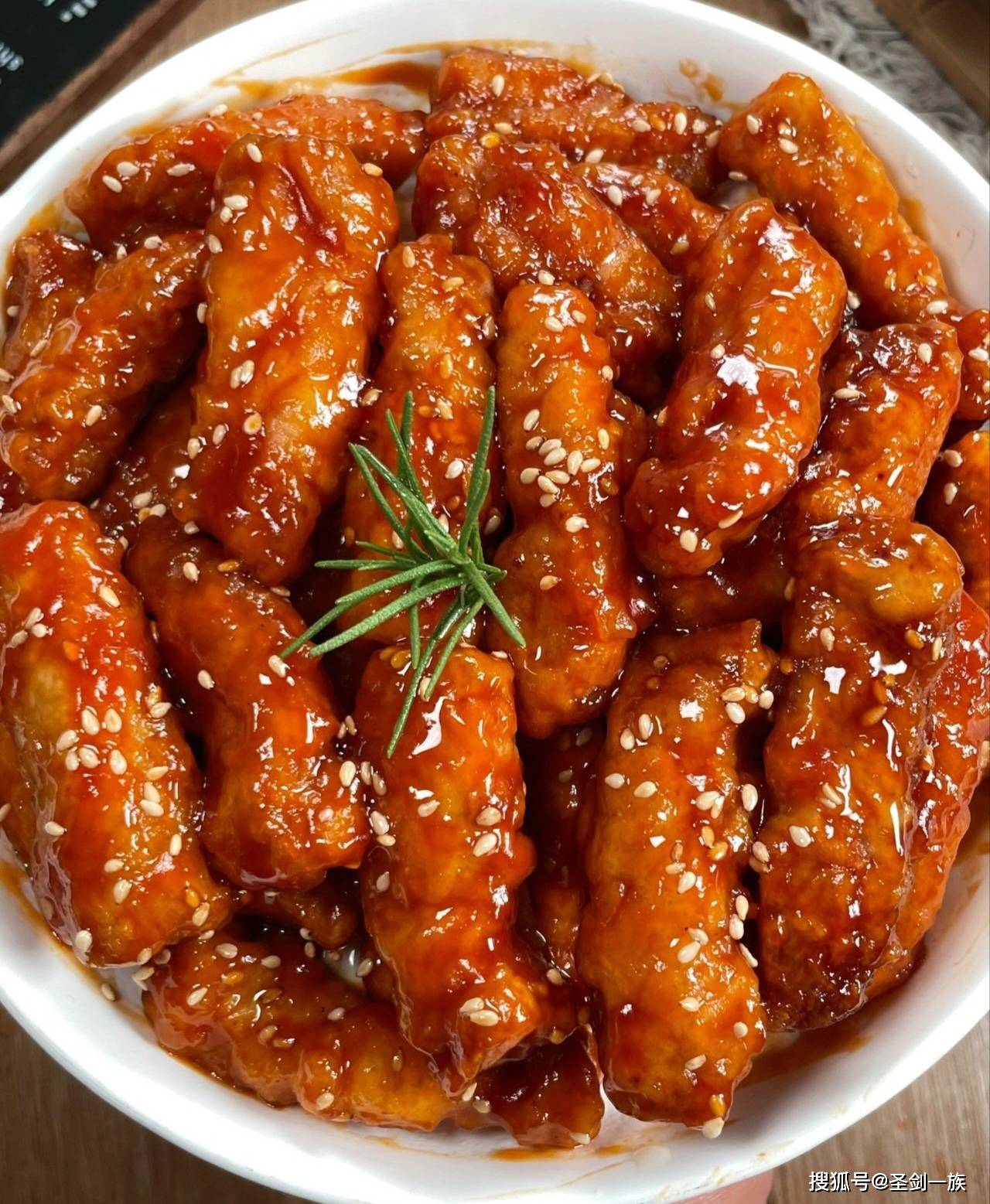 4. 锅内留底油,油热倒入料汁,浓稠后倒入炸好的里脊肉翻炒均匀,让每一根肉都裹上糖醋汁,撒上熟的白芝麻出锅装盘。