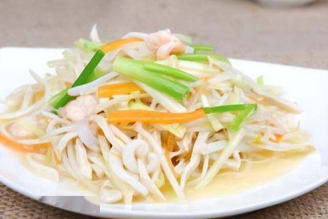 材料:猪肉,鲜鱿鱼,海蜇皮,绿豆芽,冬笋丝,韭黄,青红椒,鸡蛋,盐,蚝油,糖,生粉