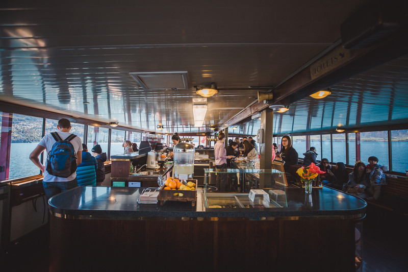 船舱内长这样,还是靠窗的座位更美丽一些,点一杯咖啡,面冲窗外,欣赏着瓦卡蒂普湖沿线的美景,该是一件多惬意的事啊。