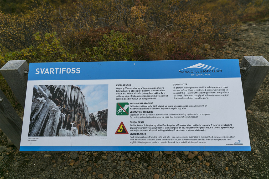 斯瓦蒂瀑布也是位于瓦特纳国家公园南部斯卡夫塔(Skaftafell)范围内,在冰岛语意为“黑色的瀑布”,之所以叫黑瀑布,并非瀑布流出的是黑水,而是因其被悬挂在高空的黑色的熔岩柱包裹而得名。这种六角形熔岩柱是由于熔岩流动极其缓慢,并最终冷却结晶而成。经过无数岁月洗礼,熔岩柱下方逐渐断落,最终形成现有的面貌。 前往斯瓦蒂瀑布,需要徒步1.7公里, 无法开车到达。停车后跟着标识徒步就可以,途中会有岔路,有标记难易程度和到达时间,关键是一路走没有风,太感恩了。