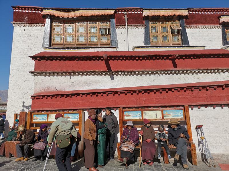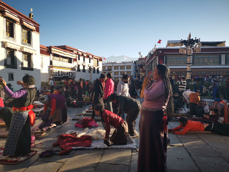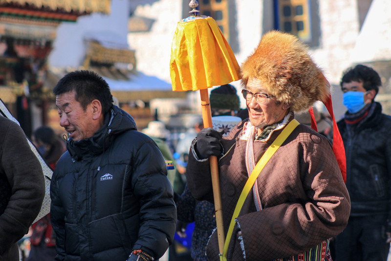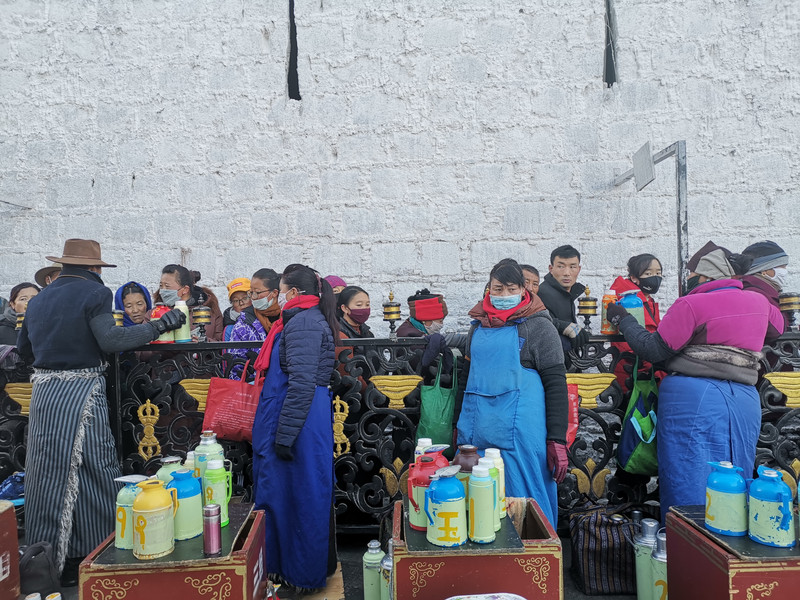 冬季,却是人们闲着没事干的时候,拉萨涌入了大量的来自各个地区的藏人们。很明显的,在排队的大昭寺朝拜的人们中看到了身着五颜六色的来自阿里的牧民,也在冲赛康的交易市场看到许多绑着红色发带的康巴汉子,八廓街的转经道上还是能看到一些身着不一样的工布藏装或者其它地区的人们。
