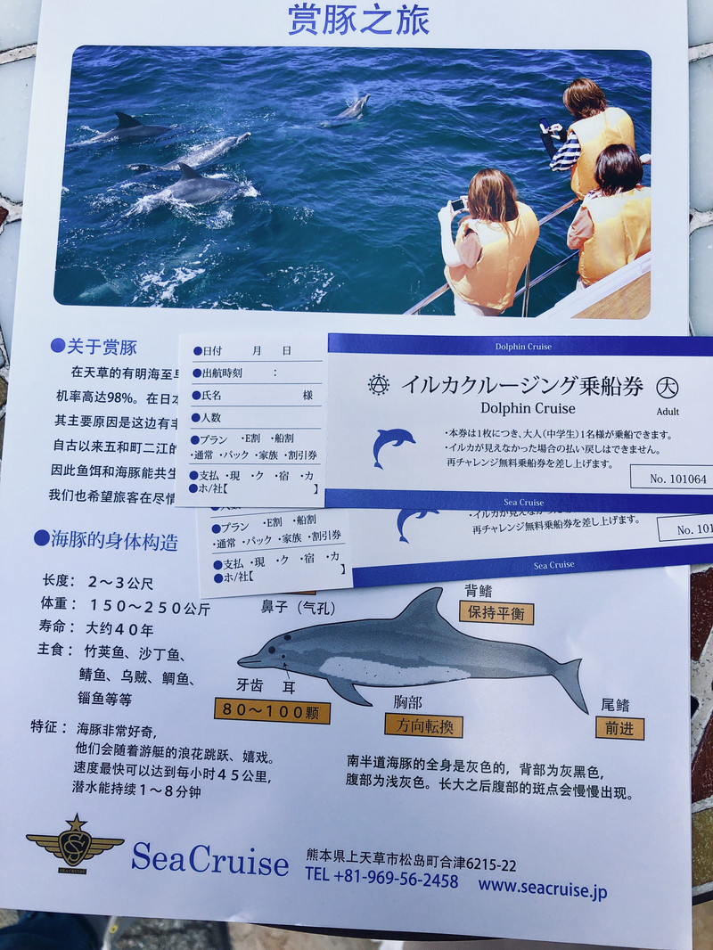熊本 5月4日 熊本-天草 追海豚 提起天草,可能很少有人知道吧。它是日本熊本县西南部大海中的群岛,并不怎么出名,但这里却有一个世上鲜见的奇观:成群的海豚在大海中自由嬉戏。 天草观海豚采取预约制,所以还是万能的TB提前预定的。