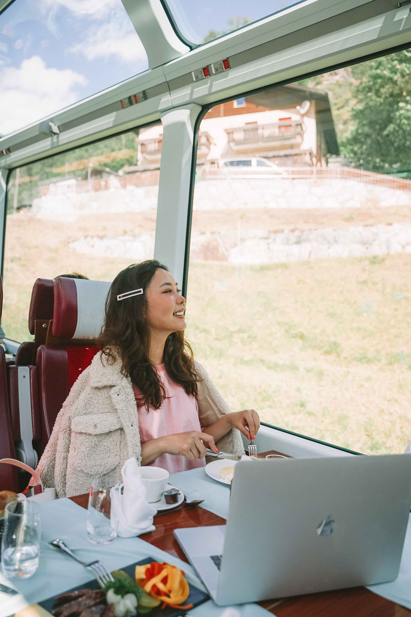 这趟列车全程7小时,穿越山川湖泊,可以说是把瑞士的绝美包揽无疑~ 隔壁坐了两对来自香港的老夫妇,看着他们手牵手上车,面对面坐下,看着窗外冰川美景,品着美食红酒静默不语,这个画面真是美好呀~