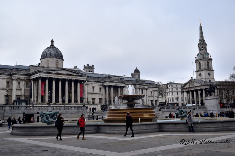 海军部拱门 见证英国海军辉煌的旧海军部 穿过海军部拱门,就是伦敦的特拉法加广场。特拉法加广场是伦敦的地标之一,广场上最显眼的标志是位于南侧的纳尔逊将军纪念柱,纪念柱建于1840年-1843年间。这是用从拿破仑军队手中夺下的铜炮铸造成的,圆柱高达53米,石柱底下是高大的方形石座和多层台阶,石座的四壁镶着纳尔逊生平所指挥的4场著名战役的铜雕。英国与法国舰队之间发生的特拉法加海战,是英国海军史上的一次最大胜利。英国此战的指挥者正是具有传奇色彩的英国海军中将纳尔逊,此战一举破碎了拿破仑统治世界的梦想,对英国历史产生了不可磨灭的影响,广场正是以此次海战的名称命名以纪念纳尔逊将军。广场的北面是国家美术馆,很多人慕名而来参观梵高的名画——向日葵,我们鉴赏水平有限,加之时间也确实不够,就没有进去,在广场上拍照打卡了事。