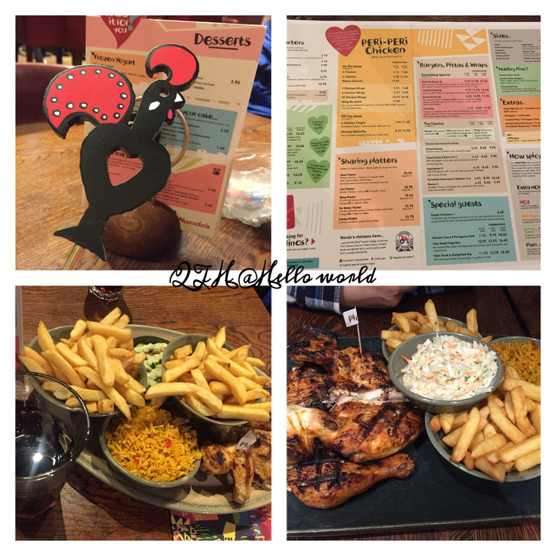 英国 上方两张是我们第一顿在英国的正餐,贝克街上的披萨小屋,当然不是国内的必胜客连锁,而是一家私营的小店,店里环境和食物都不错,我们选择的自助,得以品尝了好几种pizza和蔬菜色拉,但由于刚到英国,身上零钱不足,小费没有给足,店家都把给小费的罐子放到我们面前了,我们故作镇静实则仓皇失措地出了店门,实在要说声抱歉,不是你们不好,而是我太羞涩。左下和右下是利物浦火车站附近的汉堡王和肯德基,中间是威斯敏斯特大教堂前的热狗餐,咖啡+热狗好像也算是英国挺普遍的一种午餐方式。英国通常中餐吃得比较简单,晚上会吃一顿真正的正餐。 再想说的,就是网红店的打卡了。第一家是著名的Nando‘s葡式烤鸡店。Nando’s是一家连锁店,几乎覆盖了伦敦城区的主要区域,可以说在哪里都能找到,主营的就是烤鸡。因为是烤的缘故,烤鸡盘端上桌绝对是很香嫩的,我们一家三口的话,点上一个套餐,再加几份色拉、蔬菜之类的小盘就足够了,饮料是可以畅饮的。味道不错,加之价格亲民,应该就是最大的卖点了,孩子特别喜欢,我们在泰晤士河边和摄政街上各体验了一次,分别吃了鸡翅套餐和整鸡套餐,摄政街店明显人多,而且烤制得有点焦,虽是连锁店,还是有些区别的。Nando‘s的调料据说很有名,我们现场看到种类确实也很多,不过大部分是各种辣酱,我们觉得原味的特别香,就没有去做特别的尝试,反正,不辣的调味酱,感觉一般。