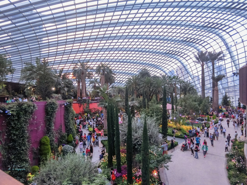 花穹 Flower Dome & 云雾林 Cloud Forest 绿意盎然的滨海湾花园矗立着两座巨型未来主义建筑:花穹(Flower Dome)和云雾林(Cloud Forest),它们是全球最大的两个无柱冷室,独立式无支撑玻璃屋顶覆盖广阔空间,放眼望去,建筑内无任何立柱阻碍视野。