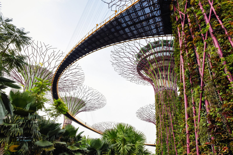 超级树 Super Tree 这11株巨大高耸的钢架水泥结构树状物被称为“超级树”,树身由超过200个品种、16万余株植物所覆盖和缠绕,是滨海湾花园里最引人注目的存在。