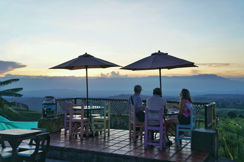 咖啡区有不少值得游览的小镇,Filandia弗兰迪亚就是其中之一,先来到镇外的观景平台 Filandia La Colina illuminated observation point,可以登上塔楼欣赏360度的山野景观,更是可以一览小镇全貌。
