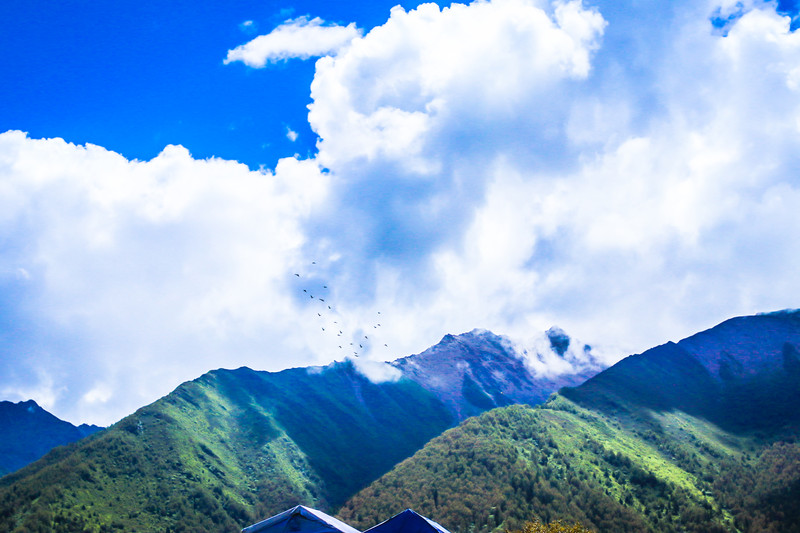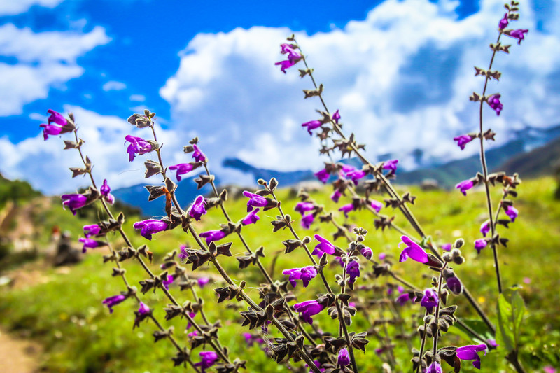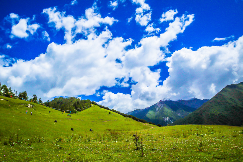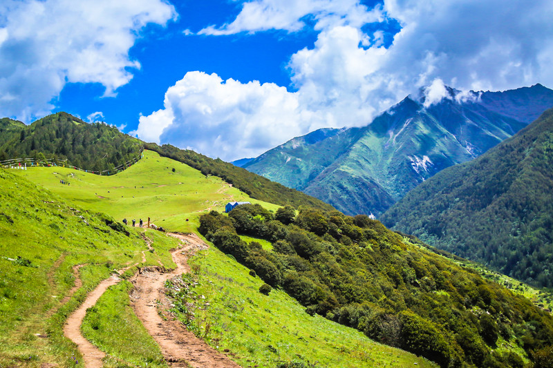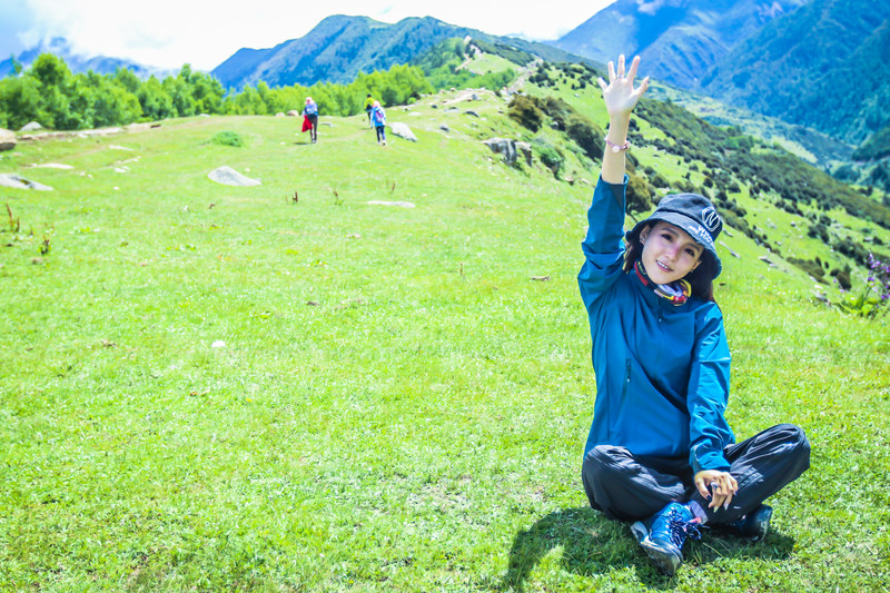 对于我这种业余之外的选手来说,倾听是最好的学习方式。整个四姑娘山景区内山峰的攀登难度从初级到高级不等,适合不同层次的登山爱好者参与。体验型山峰有大峰、二峰;拓展型山峰有三峰、骆驼峰、羊满台等;专业型山峰有幺妹峰、婆缪峰、阿妣山、布达拉峰、玉兔峰、五色山等。与来自五湖四海的小伙伴们一起参加了盛大的登山节开幕式,在如此高的海拔,这样的经历应该算是人生里珍贵的回忆了。 第三天:初次徒步海子沟朝山坪 再睁眼已经清晨7点,推开窗户后整个人在群山环抱的气息中感到一丝舒畅。雨后嫩绿色的青山,还没有完全散开的积云,一切都是新鲜的。旅行就是这样,无论旅途多么辛苦,但每当清晨醒来后打开窗户那一刻发现置身在一个陌生的城市,便会完全兴奋起来,迫不及待地打量眼前的一切。 山里的天气总是说变就变的,刚才的阴天换成了瞬间的晴空万里,洁白的云朵,远处的雪山,绿色的植被,遍地的野花,这才是小金该有的样子,你心中的想象也抵不过眼前的绚丽。