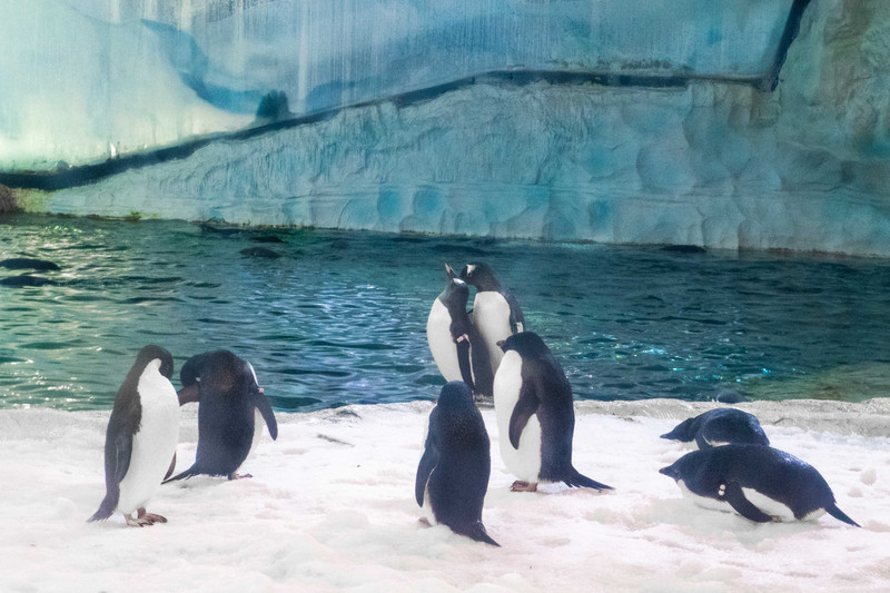领略完北极风光,感受到北极领主的高冷之后,接下来当然要拜访一下这南极代表的“府邸”―企鹅馆。一踏入企鹅馆便能看见观赏幕墙的那一边,一片冰天雪地之中,一群群企鹅如列队行军一般,一摇一摆地向前行进,只是不如部队那般敏捷,笨拙憨厚的样子可爱极了。可当一只只企鹅如跳水运动员一样入水以后,却一改在岸上时的迟缓笨拙,瞬间化身成为一支又一支水中利剑,企鹅所到之处能清晰地看见一道道游行留下的轨迹。就好比在深邃的夜空之中,一道闪电突然划过,岸上和水里的前后反差不禁让人赞叹,或许这就是深海之中一个个叫人匪夷所思的“未解之谜”。 【观:极地探险-南极企鹅】 在企鹅馆内观赏时,会发现一队又一队的企鹅当中,总有那么一两只个头超大的格外吸睛。这就是企鹅馆内的“超级明星”,南极帝企鹅是全球所有企鹅品种中体型最大的,也是南极最具代表性的动物,很多人去企鹅馆便是奔着它而去的。除此以外在企鹅馆还有一位极地明星――阿德利企鹅,在一众企鹅当中阿德利企鹅是最为活泼好动的,可爱无比。