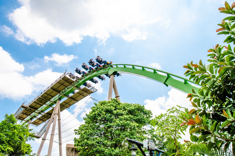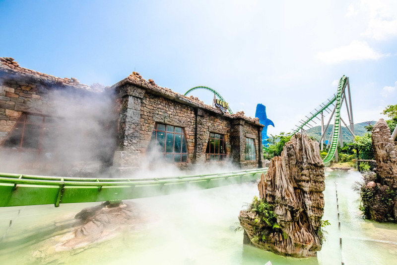 在“海豚湾”与海豚度过了一段欢乐时光之后,海底之旅仍在继续。在长隆海洋王国之内,所见之景皆与大海这一主题密不可分。而令人惊叹的是乐园内还融合了热带雨林地区的景观元素,这便来到了“雨林飞翔”分区。在“雨林飞翔”景区,要看动物一定不可错过海牛馆,来自西非的海牛体型庞大长相独特,明明长得十分奇怪却还有着“美人鱼”的称号,让人忍俊不禁。还有许多来自世界各地的珍稀淡水鱼类,奇形怪状非常独特,在海牛馆也都能一见真容。 【玩:雨林飞翔-鹦鹉过山车】 而要说起在“雨林飞翔”分区,最不可错过的一定要属那一项项惊心动魄的游乐活动,“鹦鹉过山车”便是其中之一。巨石横竖搭构而成的入口进入之后是一片片繁茂的密林,枝叶遮天蔽日相互掩映,全然一幅热带雨林的模样。而雨林之上便是腾空架起的鹦鹉过山车,蜿蜒曲折起承转合,全长1000多米,气势恢宏,光是远远看着都令人心惊胆跳,惊险程度可想而知。