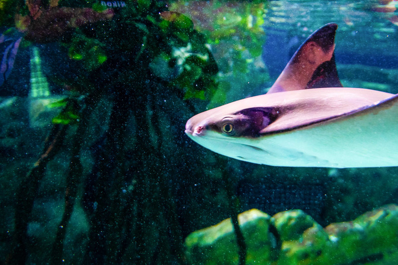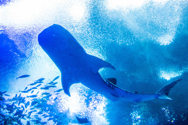 如果说在“海洋大街”穿行时有一种置身海底隧道的错觉,那进入鲸鲨馆内部则是真真切切地来到了伸向海底的隧道之中。破世界纪录的亚克力玻璃幕板,采用高科技的衔接技术,拼接建造,完美地架构出了一个圆拱形的长廊隧道,配合着巨大的圆形玻璃穹顶,共同承载着3万多立方的水体,及各种鱼类数万条。身处其中,如此壮观的景象带来的是极具冲击力的视觉体验。不仅如此,鲸鲨馆还分为浅海和深海区,为的是能够从各个方面向人们展示出最为真实、壮大的海底奇观。