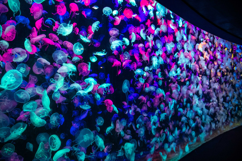 走进海洋大街,内部的景象更是让人有一种置身海底隧道的错觉,周围全是连绵不断的珊瑚礁群,而且立体感十足。而顶部位于魔鬼鱼巨大的胸鳍之下,则镶嵌着一面超大型的LED天幕。抬头望去只见壮阔无比的海洋之中水浪翻滚不断,巨大的鲨鱼摆动着尾部从头顶缓缓而过;成群结队的彩色小鱼四处穿梭五彩斑斓;呆呆的企鹅潜水遨游快如闪电;靓丽的水母大放光芒犹如一盏盏海底明灯。漫步在这一片动感十足的海洋帷幕之下,仿佛自己也变成了这深海之中的一只鱼自在逍遥。每走一步动物世界里的一幕幕海底奇景便在脑海里不停地闪现、放映,循环往复。