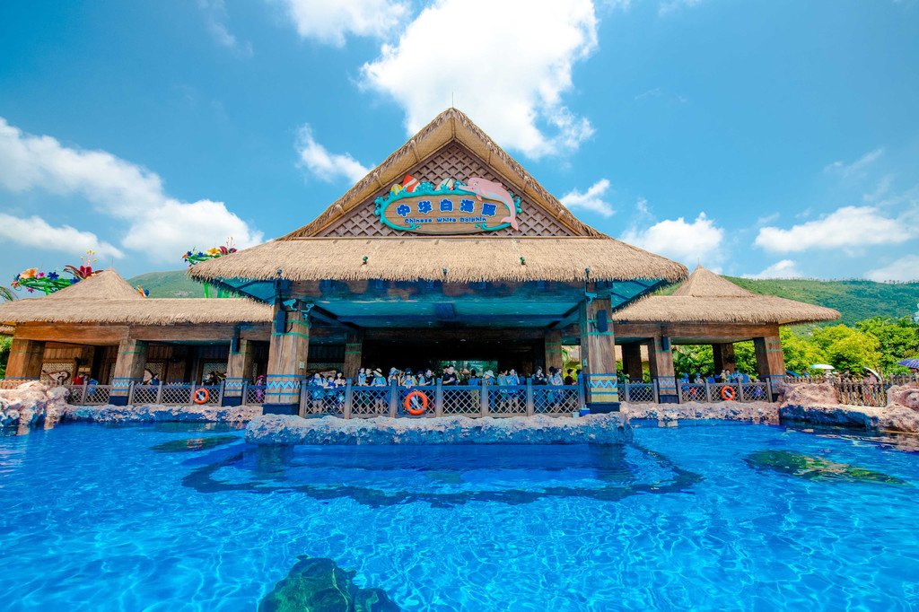 目光流转之时,一排极具热带风情的茅草顶式小亭子映入了眼帘,这便到了“海豚湾”。有着“水上大熊猫”之称的中华白海豚便居住在此。走到亭子当中倚靠着护栏,只见阳光之下本就清澈的池水波光粼粼,折射出晃动的光线非常耀眼。而池水之中那有着独特“肤色”的中华白海豚,通体粉白,“曲线”优美,天生上扬的嘴角造就了一张可爱迷人的微笑脸,十分优雅可爱。