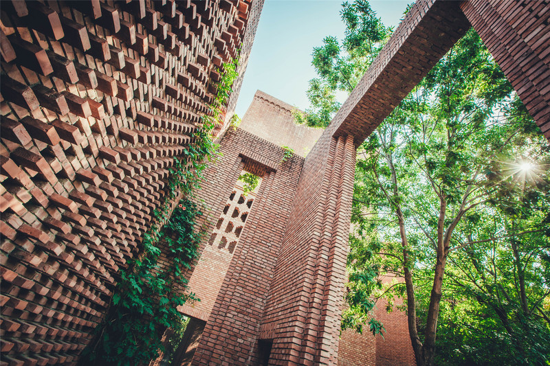 美术馆的外围是以红色砖块为主调,一格格的砖块交错堆砌起来的设计,与周边土地相结合、在原有环境中生长,采用红色砖块作为基本元素,辅以部分建筑上青砖的使用,打造出一座兼具当代山水庭院风格的园林式美术馆,也因此使其成为红砖美术馆在众多美术馆建筑中脱颖而出的最大特色。