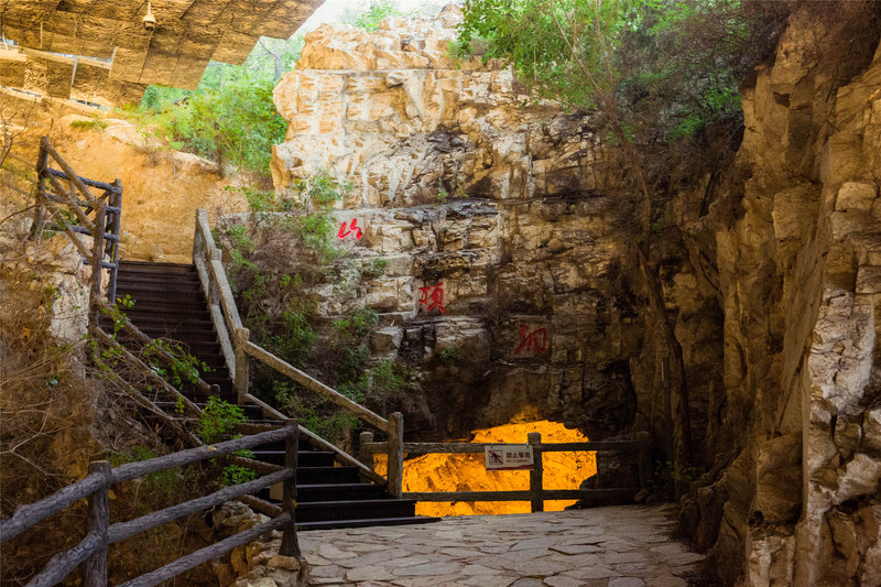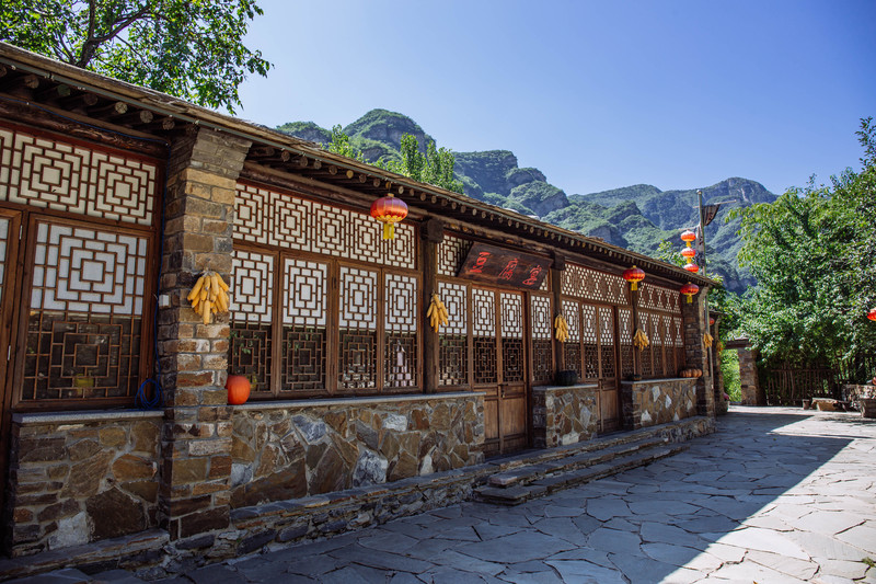 石阶隐藏在两旁茂密树木中,沿途替行人遮阴纳凉,道路通向景区内的民宿,是柿子沟村寨的村民结合坡峰岭的绿植景色和山间岩石而建的四合院民宿,为远道而来的宾客朋友留下了一个归宿。