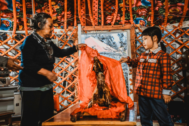 坐在漂亮的毡房里,我们开始了仪式感满满的烤全羊大餐! 首先请在场年纪最长和年纪最小的掀起烤全羊的红布~~