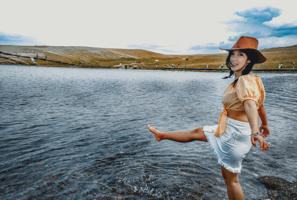 景区区间车开了差不多半个小时,我们终于可以下车了~~第一个景点是天鹅湖~~下车第一件事,先和草原合个影!因为草原是不能踩踏的,在这里所有照片都是站在步道上拍的~