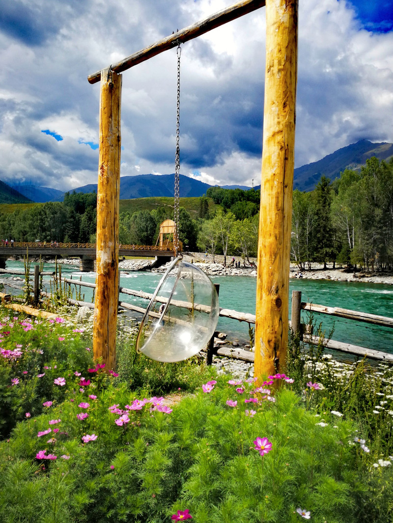 一路看风景找动物,我们到了禾木风景区的游客中心~~这里有很多旅店饭店小商店,都是很有特色的小木屋~大多数小木屋前都种了各种颜色的小花~