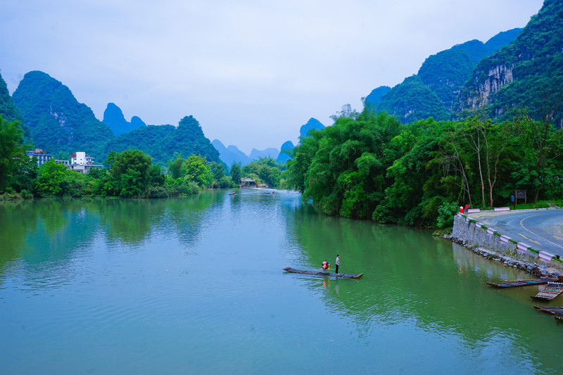 苍穹劲脆的青山, 碧波涟漪的秀水, 还有泛舟江上的竹筏。