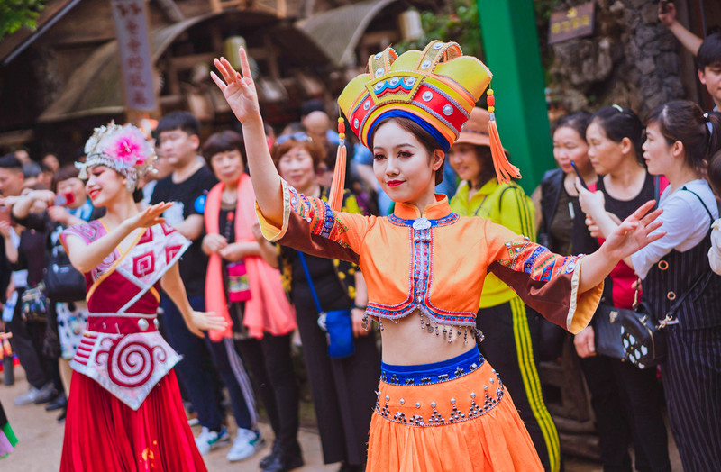 在风情街上演的民族快闪秀是最抓人眼球的, 每场表演几乎都把整个景区的游客吸引过来。 伴随着欢快的音乐,给大家一场快节奏的盛宴。