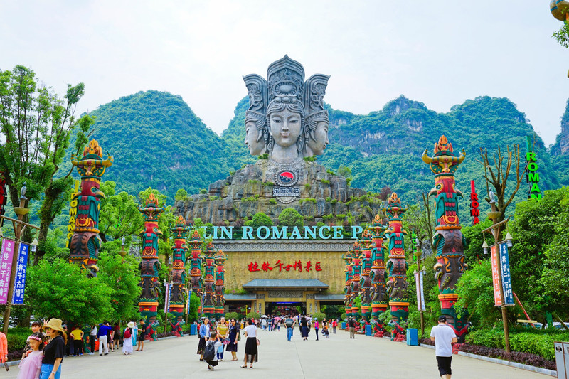桂林千古情景区的门头是歌仙刘三姐的造像, 造像有四面寓意歌仙的歌声至今依然传遍四面八方, 它的外形似乎就已经作为了这里的一种地标性存在。
