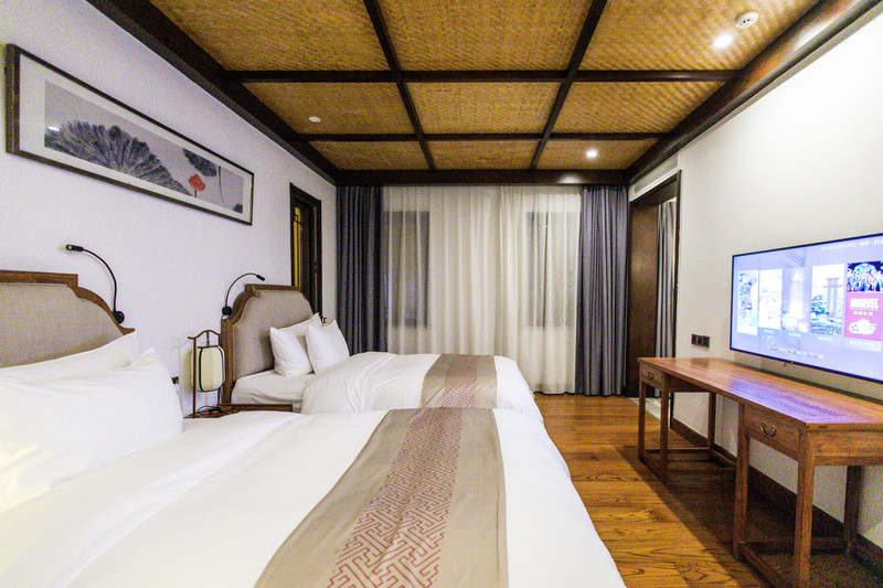 整个酒店的风格是白墙青瓦,有24栋独立的中式四合院,古香古色的江南宅院的味道,没有了城市的高楼林立,来这里就是度假的,房间里都是原木家具,浓厚的中国风建筑跟古镇的格调一样,在这里度假,真有种“偷得浮生半日闲”的格调。