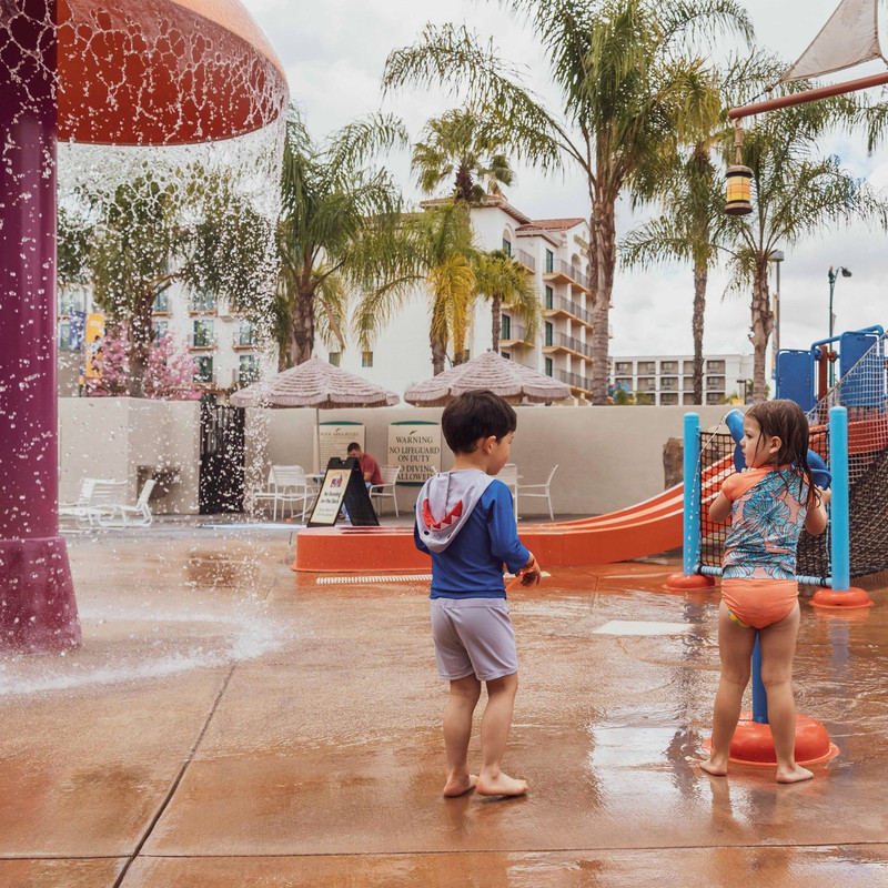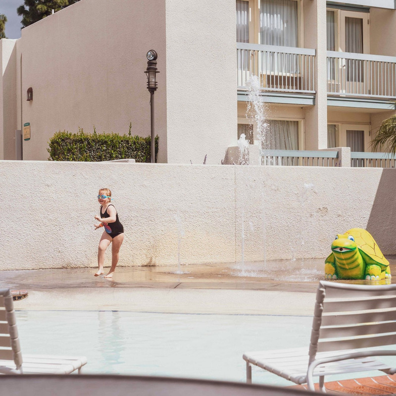 【豪生】酒店里的水上乐园 旅行前浏览迪士尼的酒店,乐园高达7000+/晚的价格直接把我夯退到手机屏外好几米远,最后搜索了一些乐园附近不错的酒店,相中了阿纳海姆豪生国际酒店和水上乐园 ,距离迪士尼乐园步行不到1公里,性价比高,还能免费玩水。对于睡眠质量不太好的朋友就不太推荐了,因为这家酒店离高速路比较近,但对于我们一家三口,那就是睡前的催眠曲啦。