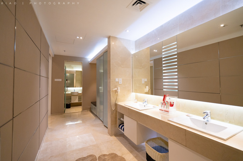 ▼另一边则是卫生间,衣帽间,巨宽敞的洗漱台(含两个洗漱池,太适合和男朋友出去了,女生自己的化妆品就要用掉一半诶),然后是单独的浴室,打开窗帘浴缸也是直面大海噢!