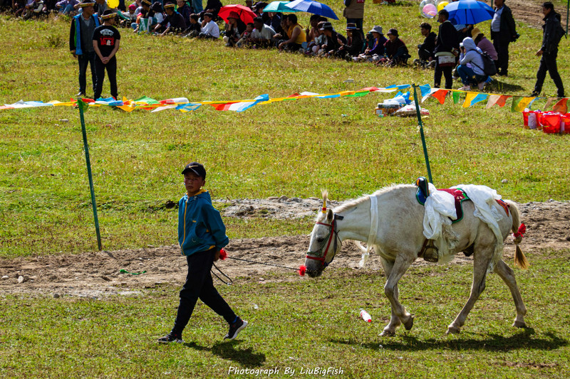 整个村子被层层林海包围,更显静谧。扎西岗村流水潺潺,云雾飘渺,时不时可见袅袅炊烟,木篱笆、农家小屋星罗棋布,还有那一片片风过荡起阵阵波浪的成熟青稞,在淅淅沥沥的小雨中都显得特别安详宁静、温柔美好。当我流连于周围美好恬静的环境难以自拔之时,热心肠的藏族姑娘告诉我:快去山坡上看看,那里正在过“赛马节”。