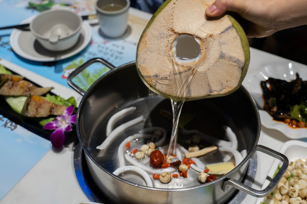 除了品质以外,这家店的服务也相当的赞,工作人员会帮忙介绍食物的最佳口感是涮几秒,也会帮忙调小料,涮肉和下虾滑,随时看到火候和锅底的情况都会来协助,也会即使清理桌面。 海南的椰子鸡基本都是三个椰子,一只鸡的标配,取最新鲜的椰汁不用水煮,搭配枸杞红枣椰子肉,还有海南特产的珍珠马蹄,包括清火的竹荪,新鲜的木瓜,一起一锅煮下来,非常的滋补养颜,口感香甜。三分钟就可以吃鸡肉了,肉质很嫩!