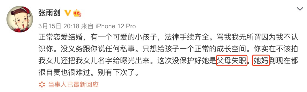 文| 老妹儿 来源 | 十点电影(sdimov) 你们发现没? 今年热搜大瓜的主题词,总离不开孩子。 院长略略回忆。 似乎从郑爽开年代孕事件定调之后,艺人官宣就有了固定格式。 华晨宇:我们(和张碧晨)是有一个孩子。 王子文:我确实有个小孩。 就在前两天,张雨剑也终于在舆论重压之下承认,自己和吴倩有一个女儿—— 这段话看着挺像回事,却挡不住评论区骂声四起。 骂他隐婚? 还真不是。 明星也有隐私权,犯不着事事都与路人报备。 对于这一点,院长也是相当认同的。 所以,这一次—— 网友们主要是看不惯张雨剑已婚有娃,还靠立单身人设混迹娱乐圈的做法。 提起张雨剑,估计有挺多人不认识。 而院长第一次知道他,还是在张一山主演的《余罪》中。 当时他演了个余罪在警校的对头,出镜率不高,角色也不出彩。 以至于后来《余罪》大热,也没见谁提起这个过目即忘的“面瘫选手”。 直到2018年,张雨剑才在网剧圈混了个脸熟。 但要说靠实力圈粉,也不至于。 他的曝光基本都来自于和吴倩合作的网剧《我只喜欢你》。 而彼时的吴倩,已经是拥有“武大校花”“小默笙”“洛洛”等各种剧内外title且小有代表作的青年演员。 沉寂已久的演员张雨剑,总算赶上个好角色。 要知道这部改编自《我不喜欢这世界,我只喜欢你》的作品,堪称霸道总裁文的照妖镜,直接将真实美好的恋爱关系照进生活。 剧中,男主言默这个角色的原型正是笔者公子乔一的亲老公。 两人低调,从不出镜。 所以,被改编成网剧的《我只喜欢你》直接把书粉变剧粉,也把书粉对F君的情结全部托付给了张雨剑。 F君有多好? 贴一条微博,让你感受一下。 如果说,蒙淇淇打算赚很多钱、难过时和老公哭遍全世界的凡尔赛,会让人忍不住发笑。 那么F君的脚踏实地、持重内敛,就是实打实地让人心动。 因而从那时开始,张雨剑似乎发现了适合自己在娱乐圈立足的人设—— 一个略显木讷却稳重可靠的老干部形象。 所以,为了呼应这个角色的特点,他曾公开表示自己从不用智能手机。 但是,他发的微博前缀全是iPhone客户端。 哦对,他承认自己有女儿那条微博已经从iPhone 11 Pro Max 换成了iPhone 12 Pro…… 你就说,打不打脸? 2020年初,张雨剑因参演热播剧《下一站是幸福》,演艺事业又上一级台阶。 于是,他开始趁热打铁,和同样出演该剧的虞书欣炒CP。 在这段直播中,虞书欣都称张雨剑为贺老师(剧中角色名),并表示自己是蔡敏敏(剧中角色名)。 但张雨剑却说,虞书欣(直接用本名)经常给他发短信。 幸好,虞书欣的反应够快,才没有造成误会。 在综艺中,他与虞书欣牵手互动。 参加节目,又强调自己想要恋爱。 然而,张雨剑和吴倩早在合作《我只喜欢你》之后便被爆出牵手、拥抱、见家长等新闻。 甚至在2019年12月时,还有张雨剑陪吴倩去做产检的照片流出。 所以,他2020年还用单身人设炒哪门子CP啊? 网上越来越多人替吴倩不值,连院长也怀疑她是在拍戏时被剧中人设蒙蔽了双眼。 他是张雨剑,才不是书中的F君。 说到这里,再重新看看他公开承认自己与吴倩生有一女的微博—— 爹味十足。 整段微博内容中,吴倩甚至不配有姓名。 院长回想起,李荣浩在《中国好声音》的舞台上听到《雨爱》,大家立马说是嫂子的歌,李荣浩却认真地纠正:“不是嫂子,是歌手杨丞琳”。 由此深感,不同男人对妻子的尊重程度,真是存在天壤之别。 通读微博,张雨剑的语气中有埋怨,也有责怪。 他认为没保护好孩子是父母失职。 仿佛如果不是孩子曝光、吴倩昨日稳居热搜第一、一堆网友去他评论区轰炸,他就还能继续不动声色地维持单身人设。 于是,有网友表示疑问,张雨剑的最后一句“别有下次了”,到底是在警告谁? 不好说。 但经过这件事之后,让张雨剑本就不旺的人气雪上加霜,倒是真的。 放眼娱乐圈,在立人设过程中翻车的例子比比皆是。 比如,靳东的“诺贝尔数学奖”事件。 连诺贝尔本人都不知道…… 另外,还有年逢毕业必挨骂的翟天临。 他的学霸人设,让毕业审查愈发严格,更让无数毕业生叫苦不迭。 不是院长多说,连中国知网都不知道,还敢装博士? 咱们也都是一个个写论文过来的。 知网查重简直是挥之不去的梦魇,咋可能忘? 说了这么多,院长也承认,人设是一个聪明的营销方式。 在这个社会飞速发展、人们愈发健忘的时代,各种流量小花小草,一茬接一茬。 艺人们想靠一些标签、关键词来加深观众对自己的记忆点,院长倒也不是不能理解。 但是,经营人设是一条漫长的旅途,并且劳心劳力,很难做到风雨不改。 而为了博取观众缘而在道德、学术等方面弄虚作假,结果只会是得不偿失。