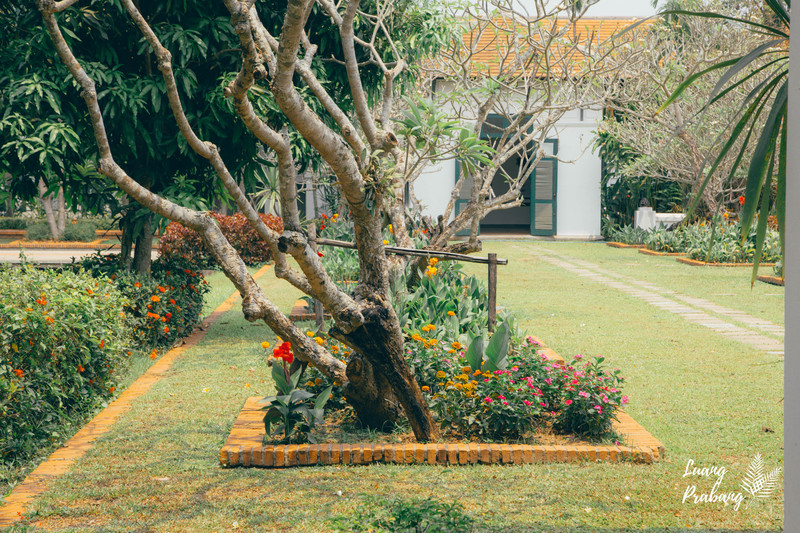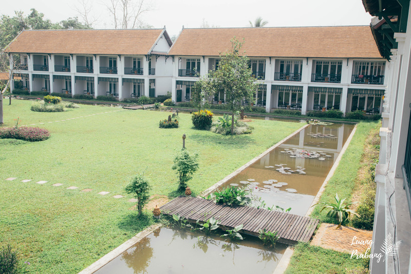 大琅勃拉邦酒店 酒店位于湄公河畔,是前王子的官邸,整个环境优雅清美,四晚全程都住在这里,占地面积非常大,步行逛上一圈也要许久,除了庄园还包括博物馆、诵经堂、纪念堂,以及佛学院、花园、泳池,不过泳池几乎没什么人。 清晨的空气如泉水般沁人心脾,河边的树传来隐隐约约的沙沙声。晨风吹起白色幔帐,在花园露天餐厅享用早餐,抬头便能望见远处隐隐约约的小山,偶尔有驶过的轻舟,湄公河蜿蜒流淌,波光荡漾。
