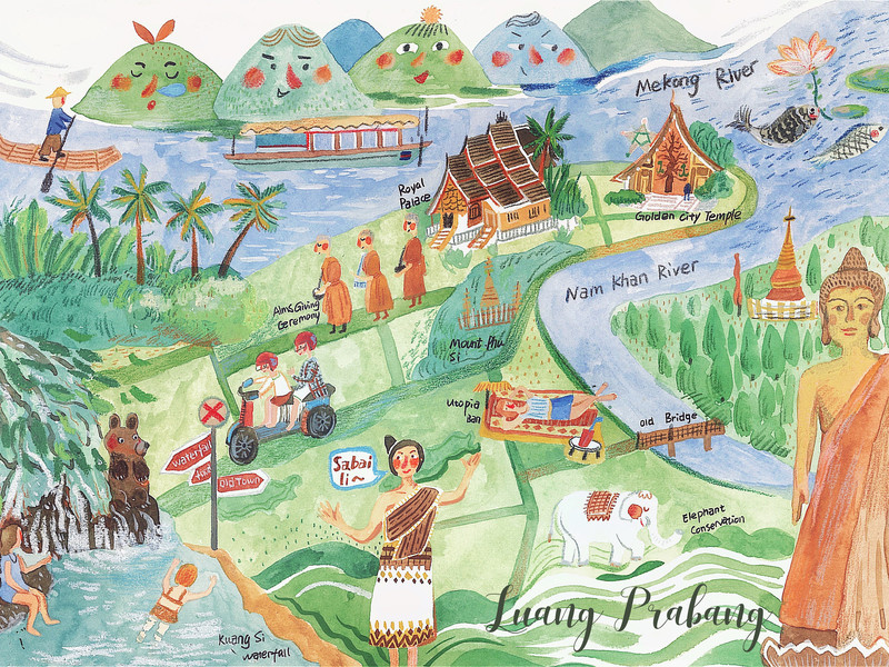 也许正因对周遭生活感到厌倦,才会对另一种生活心生向往,视世外为净土,经书中说:心清净,佛土清净。从微笑中传递来的心身平静,也是对他人最好的回馈。 我喜欢这样慢节奏的旅行,无需执着于去多少景点,拼命吃下多少美食,“慢”就是最棒的体验了,一草一木、一石一瓦都是老挝的前世今生,一呼一吸间都是平和的时光,山峦云朵,河面倒影,船只穿梭,如梦如幻。 在琅勃拉邦,游人会待上比预期更久的时间,当然也有不少人很快就离开了,神奇之处在于,就真的暂时放下了执迷的名财权欲,无论做什么,延续着宁静专注,逐而净化心境。绘画是件非常自我的事,与琅勃拉邦的连接,成为了我宁静而深邃的创作源泉。 一得即永得,一念即永恒。对每一寸途径的土地都抱有充沛的好奇心和平常心。选择喜欢的地方停留。2020年有点难,计划的很多国外的地方都无法前往,但是心已启程,随时出发,随时停留。 愿疫情早日过去。 愿一切有情众生离苦得乐。 愿一切得到慈悲。 来日方长 我有预感一定会再次回到这里。 —— 实用攻略 —— 老挝签证: 提前在网上办的,3-5个工作日就能拿到,也可以选择落地签,不过需要现场排队很久,我喜欢在护照上盖上章和贴签证,作为一种旅行的收集,就提前办好了签证,老挝的签字意外的十分精美,很有意义。