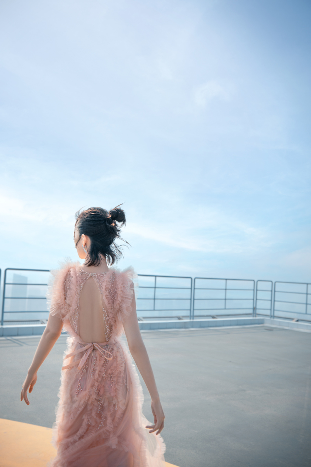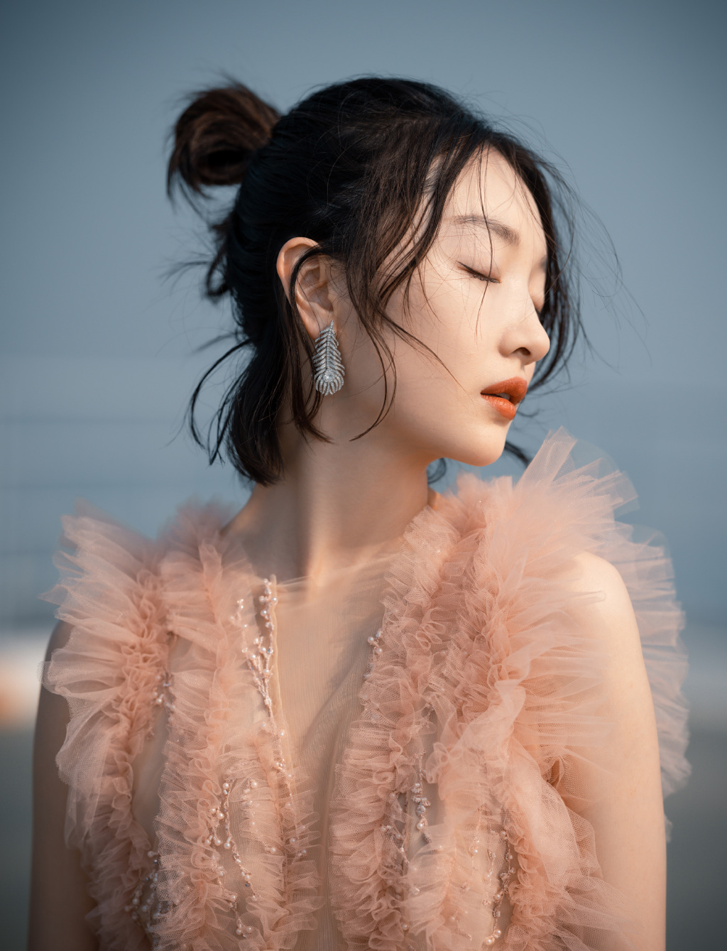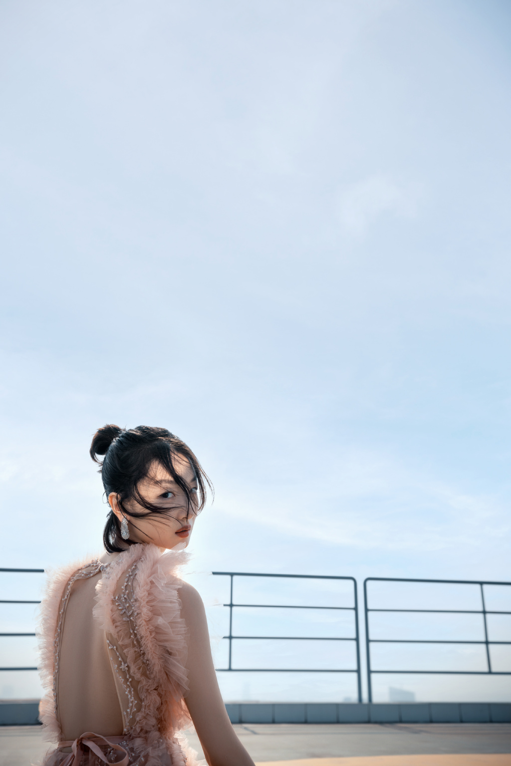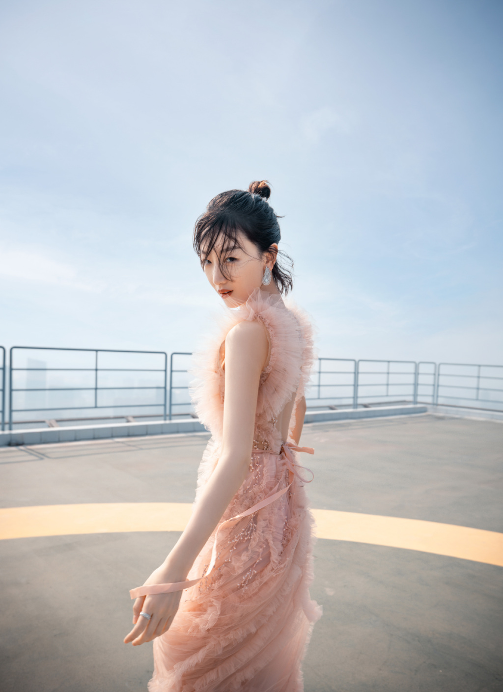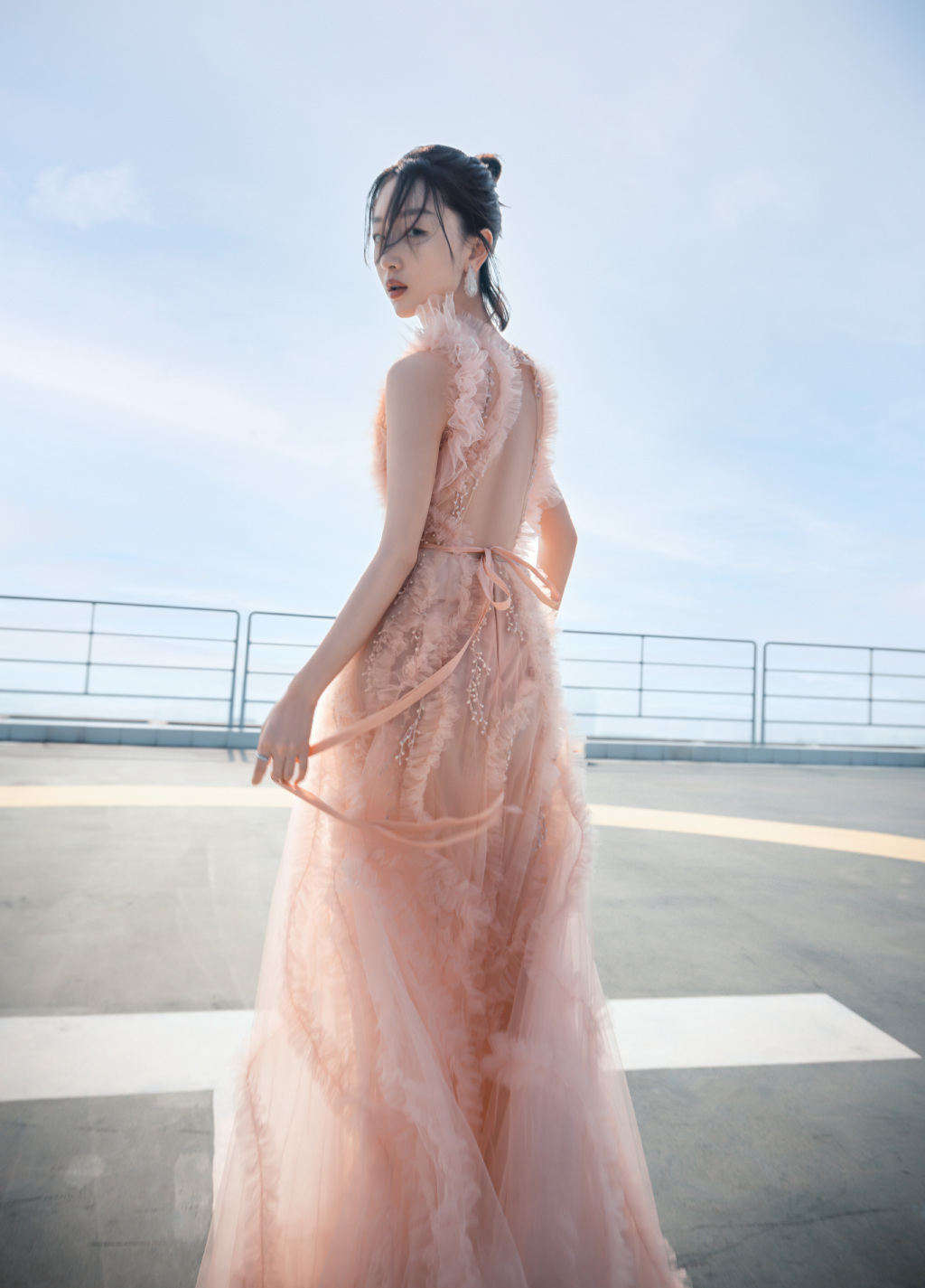 6月25日,周冬雨工作室在社交平台晒出一组全新大片,画面中周冬雨身穿淡粉色无袖薄纱长裙,头上扎起丸子头,几缕碎发迎风拂面,随性洒脱,华丽耳饰加持,更增添一丝精致感。
