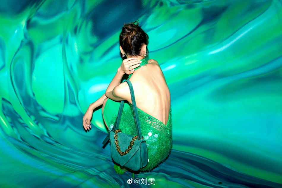 7月30日,刘雯微博晒出一组绿色亮片露背裙性感大片超惊艳,妩媚中酷飒不减完美展现身材曲线。