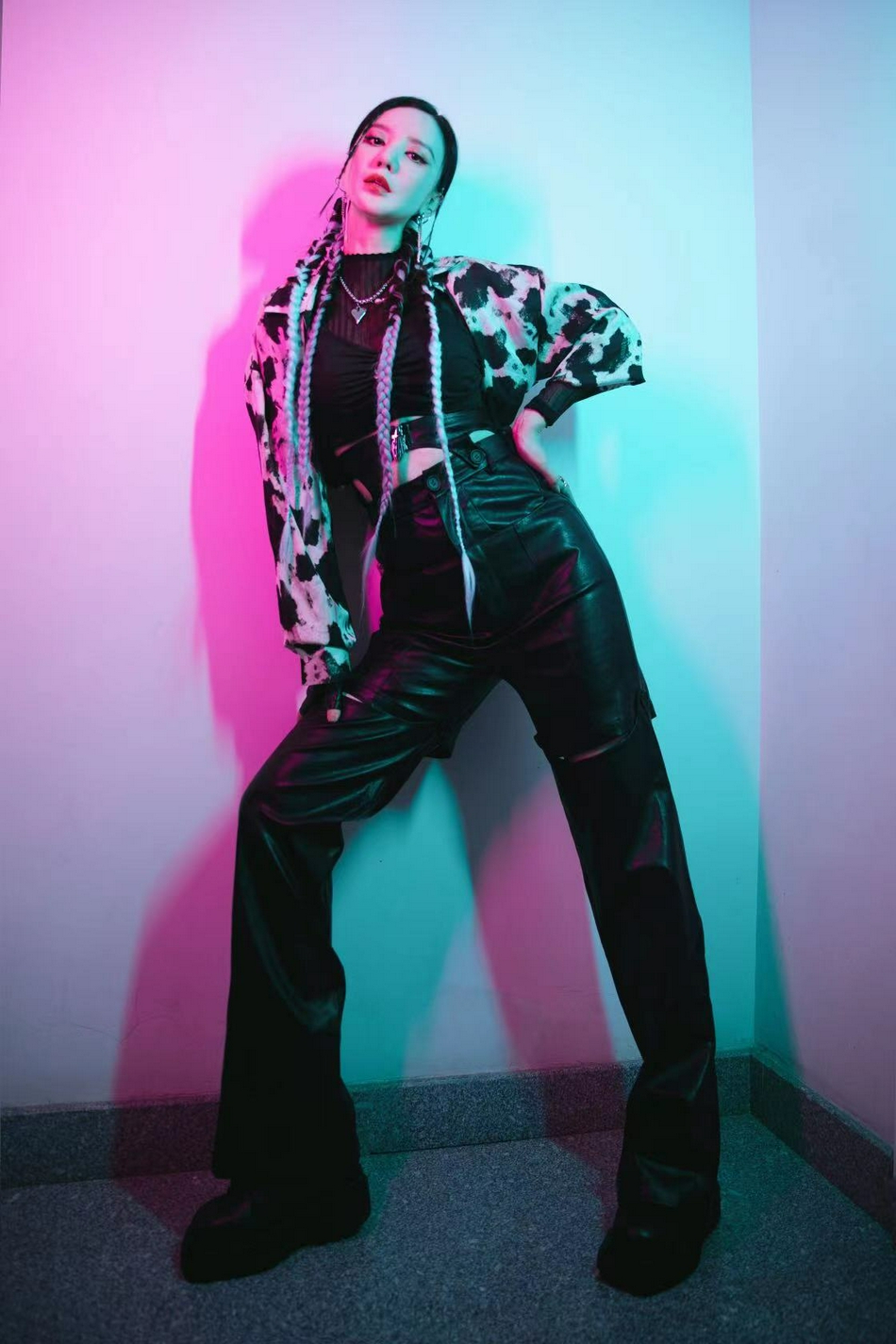 张萌撞色拳击辫个性吸睛 穿皮裤化身酷炫机车女孩[6P]