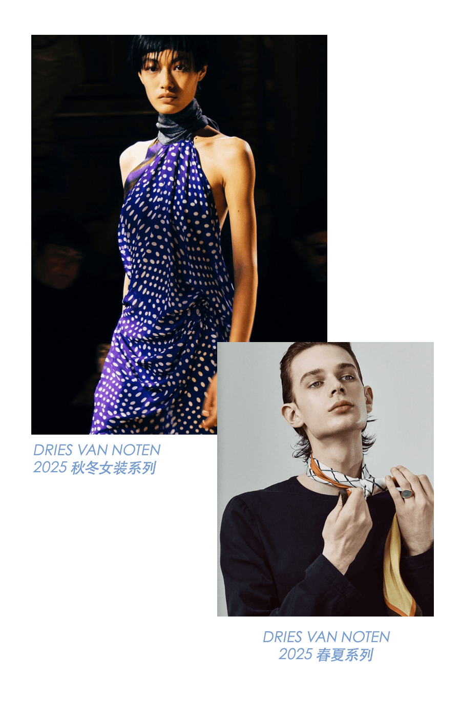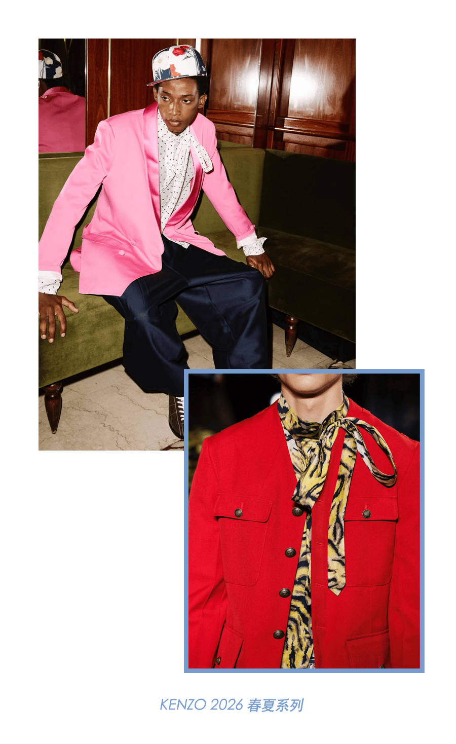 DRIES VAN NOTEN早在数季前就开始使用亮色、花卉丝巾搭配正式西装,暗示浪漫与理性并存的男体气质;而JW ANDERSON则借助毛线缠绕、皮革打结等形式,让颈部装饰超越性别的界限,成为身份流动的象征。