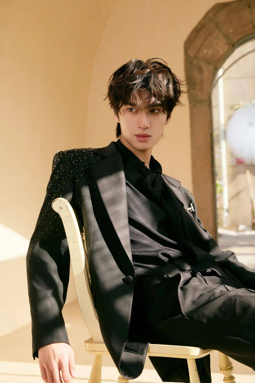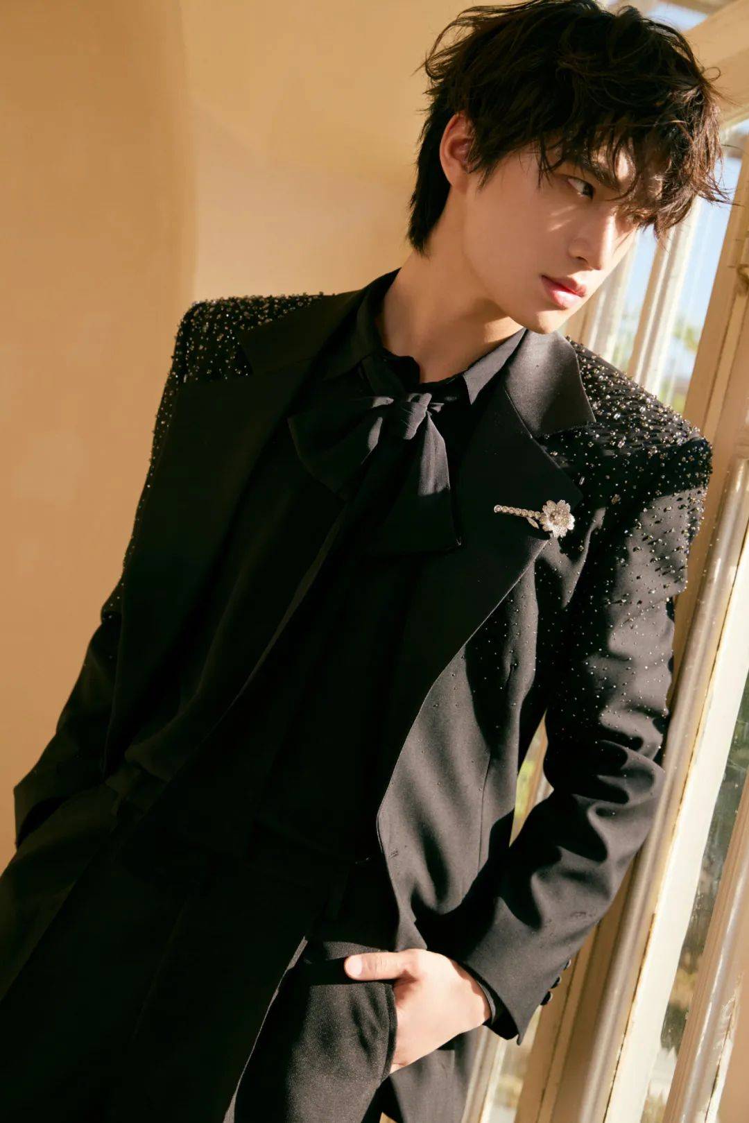 吴磊这身是全套的Saint Laurent,来自2025春夏男士系列,黑色礼服搭配荷叶边花式领结白衬衫,优雅矜贵的小王子风范。