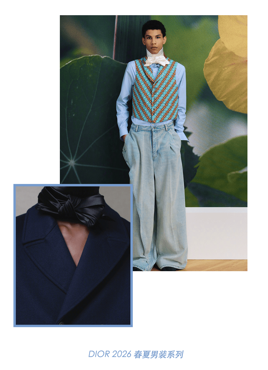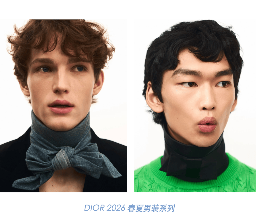 有这么多时尚嗅觉敏锐的男生们率先演绎脖颈间的有趣穿法,似乎预示了它的流行。今年六月DIOR全新发布了男装系列,贯穿整季的宽大领结设计,不仅重新定义了脖颈的造型可能,也让性别、风格和身份在这一寸空间中展开了新的对话。