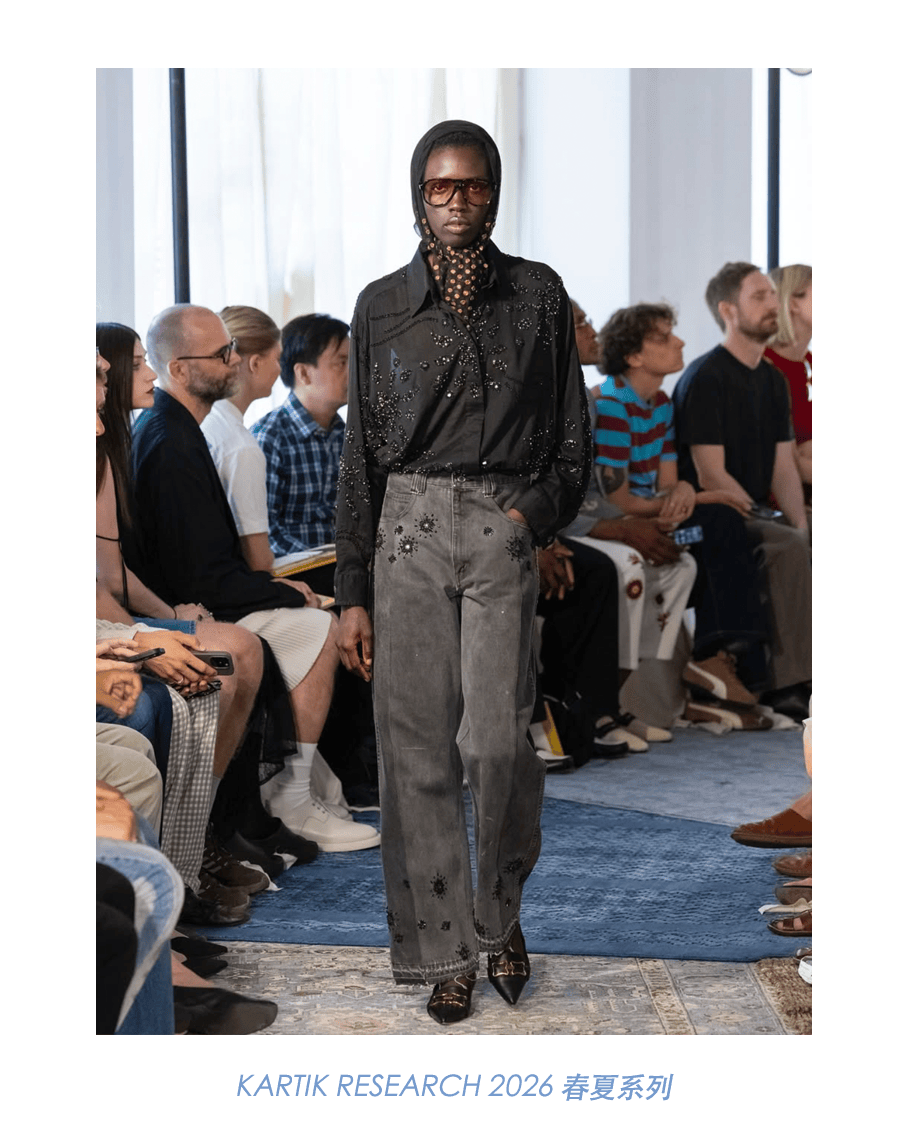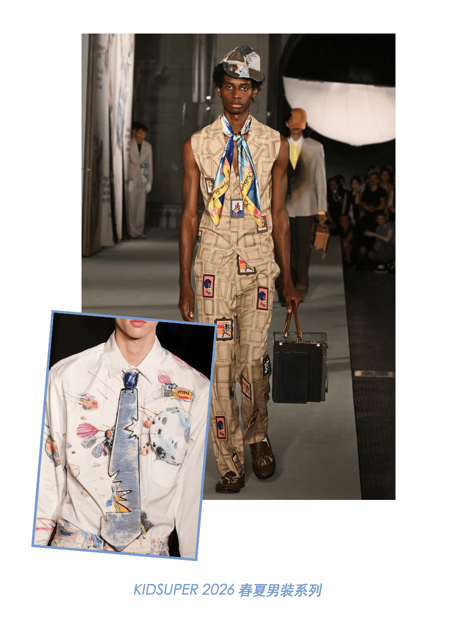 在这个强调个性表达和细节构建的年代,“颈间”正悄然成为最具创意张力的舞台。若从本季的秀场观察开始,独立设计师Kartik Research,将印度传统纺织与青年文化结合,在2026春夏系列中用丝质头巾绕颈而结,既有装饰性又具文化意味。KIDSUPER则延续其漫画风与DIY趣味,以针织围巾状装饰缠绕于模特脖颈,夸张却带有温度。