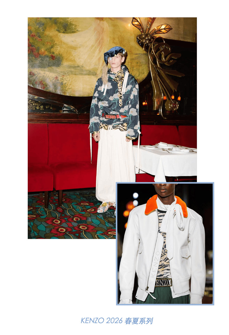 而KENZO在Nigo的主导下,将日本传统织物与学院风格结合,推出多条图案感强烈的织物围巾,与成衣呼应造型主题。