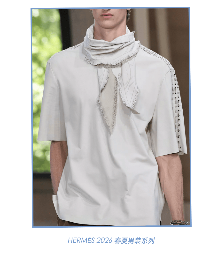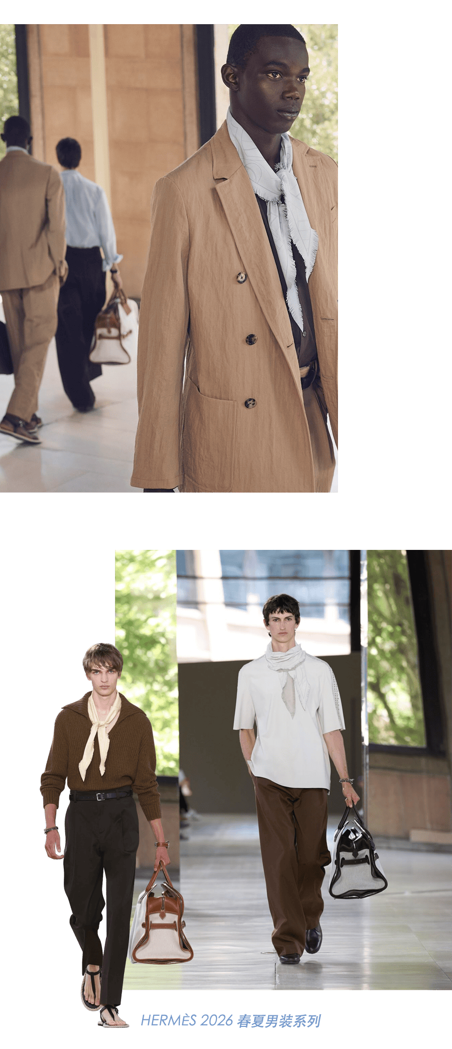 另外,爱马仕延续其对男士配饰的优雅追求,以柔软丝绸打造精致小方巾,扎成潇洒领结,隐隐指涉20世纪中叶法国男士的日常着装美学。