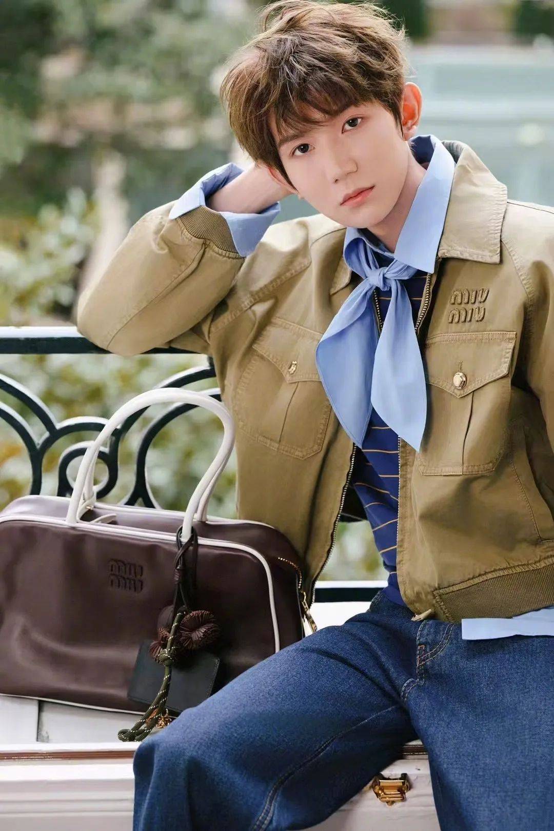 王源之前去Miu Miu大秀的看秀造型中也有系带领结的出现,用蓝色领结搭配牛油果色外套,不过他这一身显得更清新活力,又不失文艺气质,是比较日常的穿法。