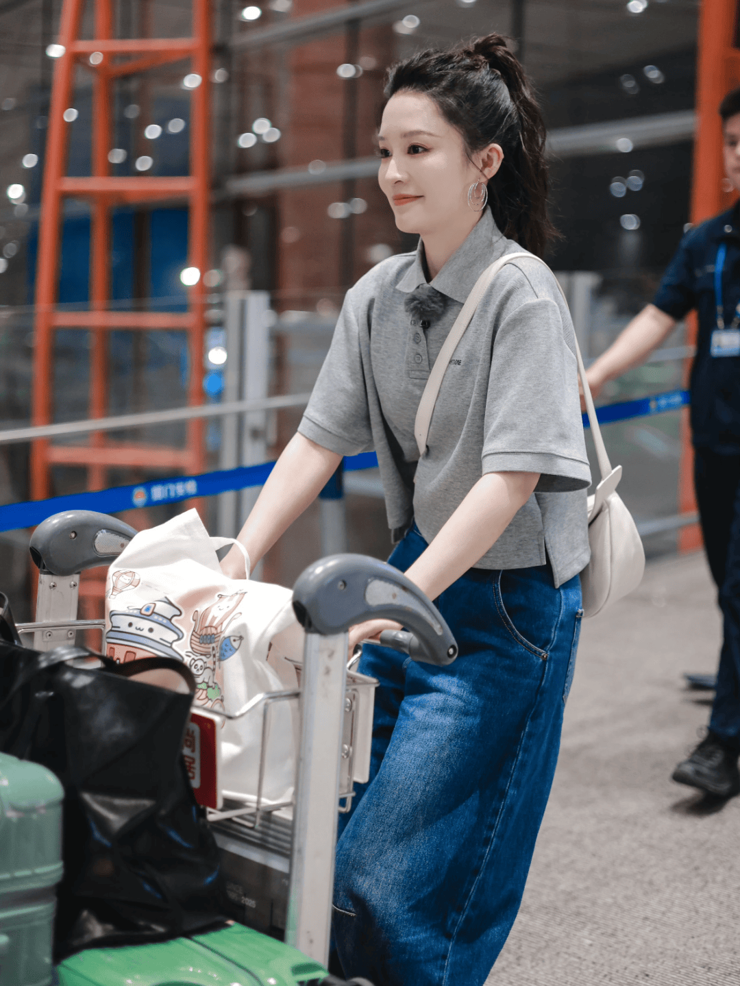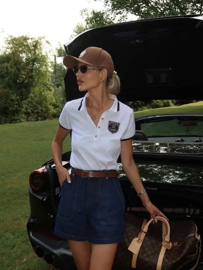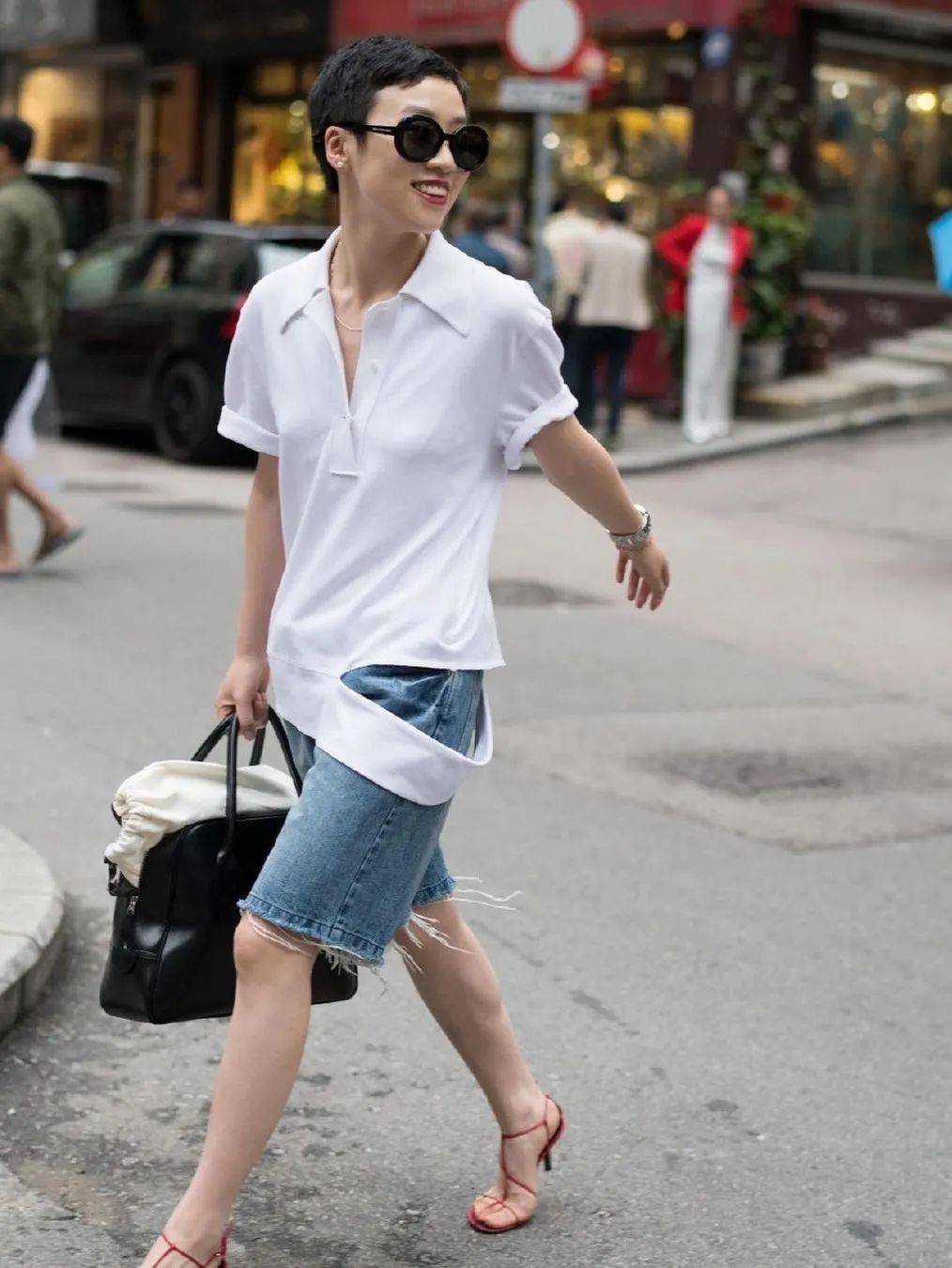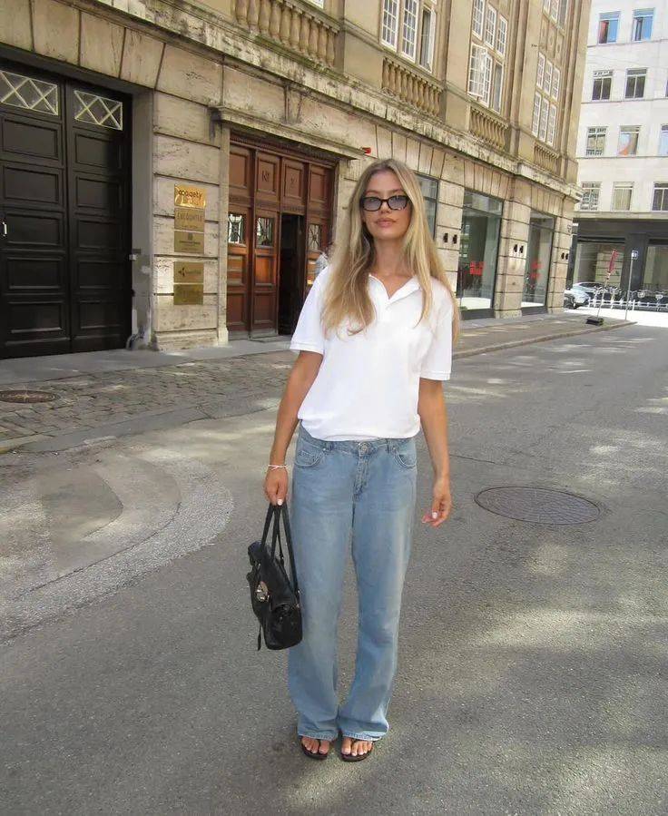减龄技巧:纯白色Polo衫搭配高腰牛仔裤,扎起高马尾,利用牛仔裤“天生减龄”属性,视觉年轻5-10岁。